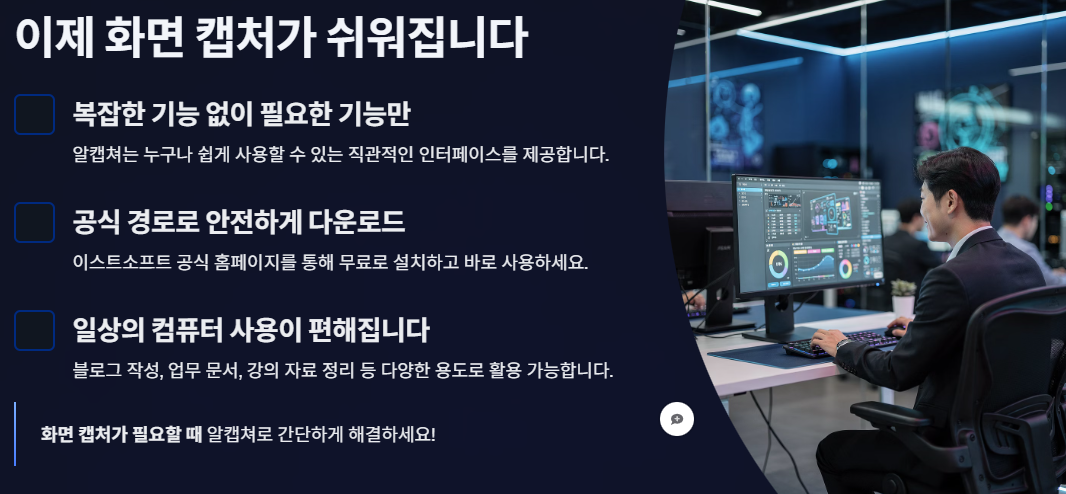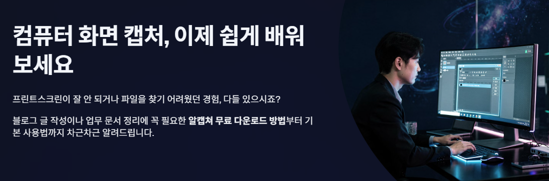 알캡쳐 무료 다운로드 방법을 찾는 분들 역시 이런 불편함 때문에 검색을 하시는 경우가 많습니다. 특히 블로그 글을 쓰거나 업무용 문서를 정리할 때는 간단하면서도 안정적인 화면 캡처 프로그램이 꼭 필요합니다. 이럴 때 많이 찾는 프로그램이 바로 알캡쳐입니다.