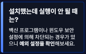 백신 프로그램이나 윈도우 보안 설정에 의해 차단되는 경우가 있으니 예외 설정을 확인해보시기 바랍니다.