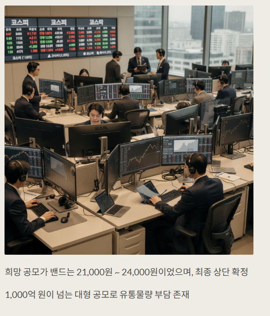 공모 규모가 1,000억 원이 넘는 대형 공모주에 해당하며, 상장 직후 유통 물량 부담은 상대적으로 큰 편입니다.