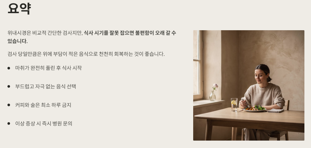 위내시경 검사를 받고 나면 가장 먼저 드는 질문이 있습니다. “이제 언제부터 밥 먹어도 될까?” 특히 수면 위내시경인지, 비수면 위내시경인지에 따라 식사 가능 시간과 먹어야 할 음식이 달라 헷갈리는 분들이 많습니다. 이 글에서는 위내시경 후 식사 가능 시간과 처음 먹기 좋은 음식, 검사 후 주의해야 할 음식까지 한 번에 정리해드립니다.