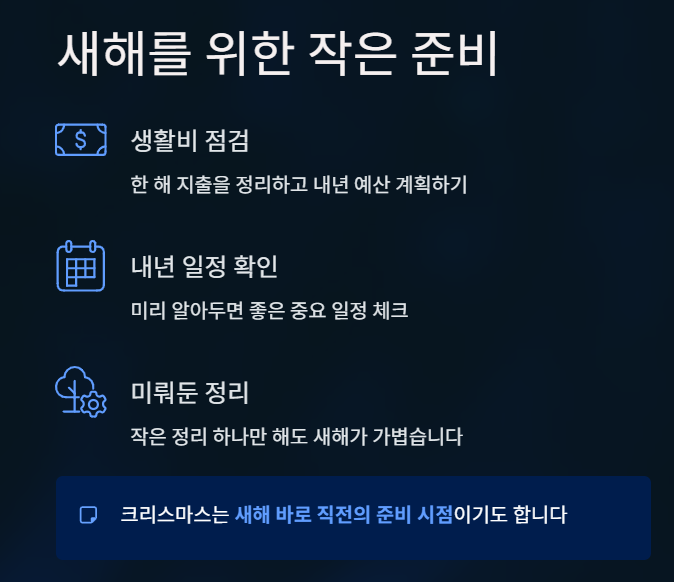 - 연말과 새해를 함께 준비하는 시작점으로 활용하면 좋다