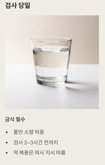 - 물은 소량만 마실 수 있고, 검사 2~3시간 전까지만 허용돼요.