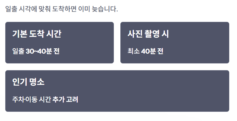 일출 시각만 확인하는 것보다 30~40분 일찍 도착하는 계획을 세우는 것이 가장 중요합니다.