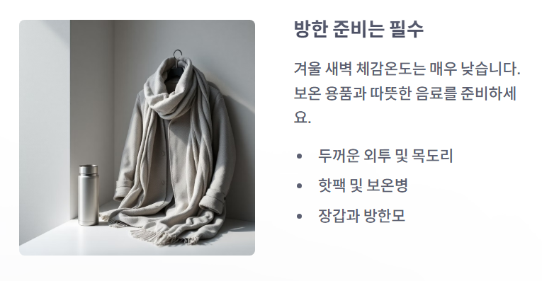 특히 장시간 야외 대기 시에는 보온 용품과 간단한 방한 아이템 준비 여부에 따라 만족도가 크게 달라질 수 있습니다.