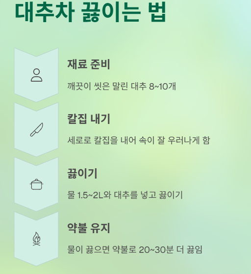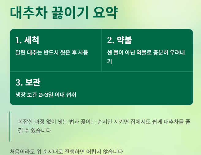 이 방법은 대추의 단맛과 향이 부드럽게 우러나는 기본 방식입니다.