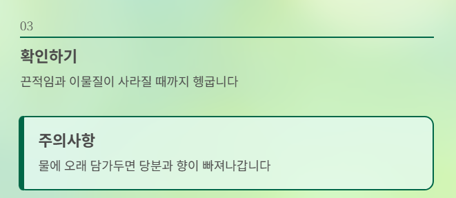 - 물에 오래 담가두는 방식은 추천하지 않음