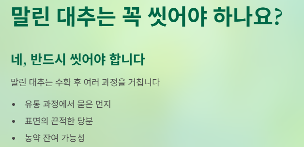 정리하면, 말린 대추는 반드시 씻은 후 사용하는 것이 안전하며,