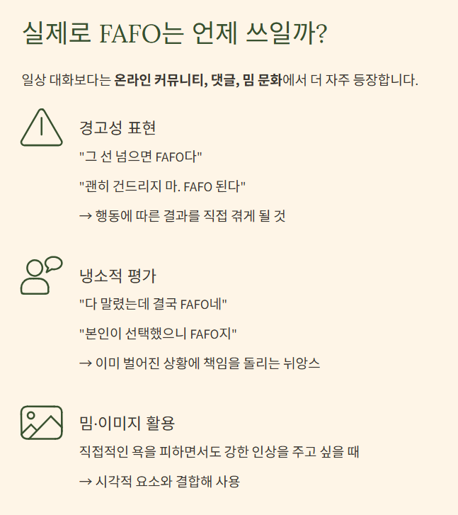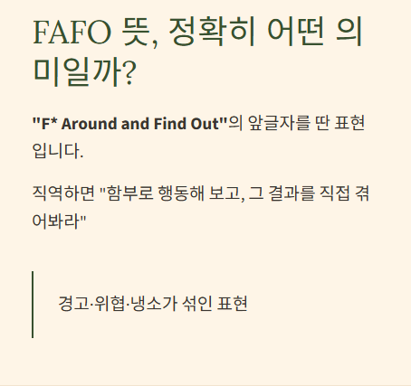 - FAFO 뜻: 함부로 행동하면 그 결과를 직접 겪게 된다는 의미