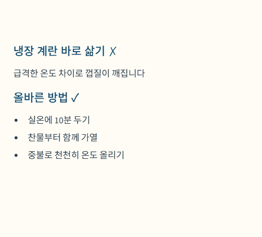 - 냉장 계란은 바로 삶으면 실패 확률 ↑
