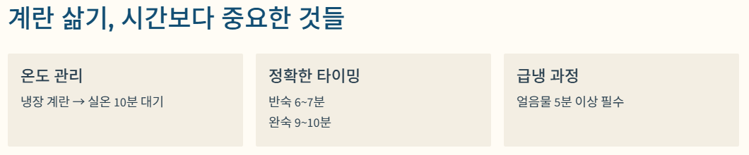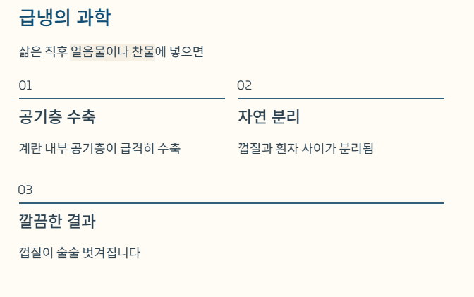 | 껍질 안 벗겨짐 | 식힘 과정 생략 | 얼음물 급냉 |