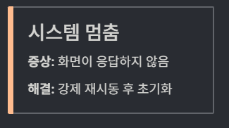 - 시스템 멈춤 → 강제 재시동 후 초기화