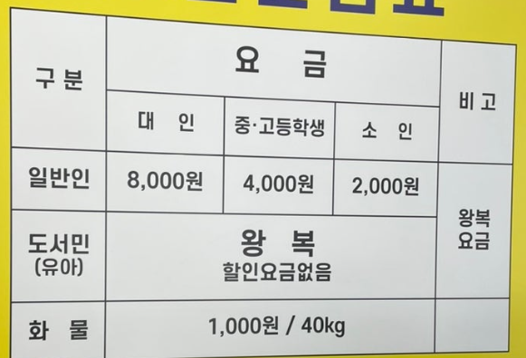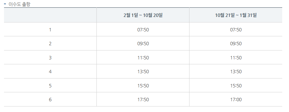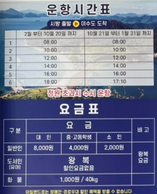 이수도에서 나오는 배편 역시 10월 21일부터 겨울인 1월 31일까지는 오후 5시에 마지막 배편으로 이수도에서 시방항으로 나올 수 있습니다. 10분 소요되는 배편 거리로 짧은 편이지만 그래도 마지막 배편은 조금 빠르게 마지막 배편을 운행하는 것으로 보입니다.
