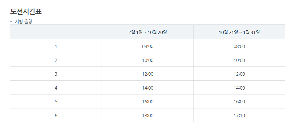 시방에서 출할하는 경우 10월 21일부터 겨울인 1월 31일까지는 마지막 배편이 오후 5시 10분입니다. 다른 시간대는 2시간 간격으로 운행합니다.