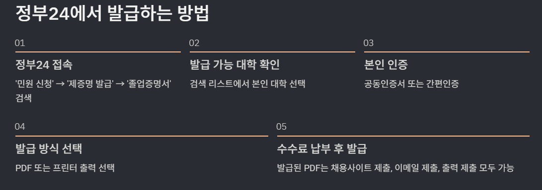※ 단, 외국 대학 졸업증명은 해당 대학에서 직접 발급받아야 하며, 한국 시스템과 연동되지 않는 경우가 많습니다.