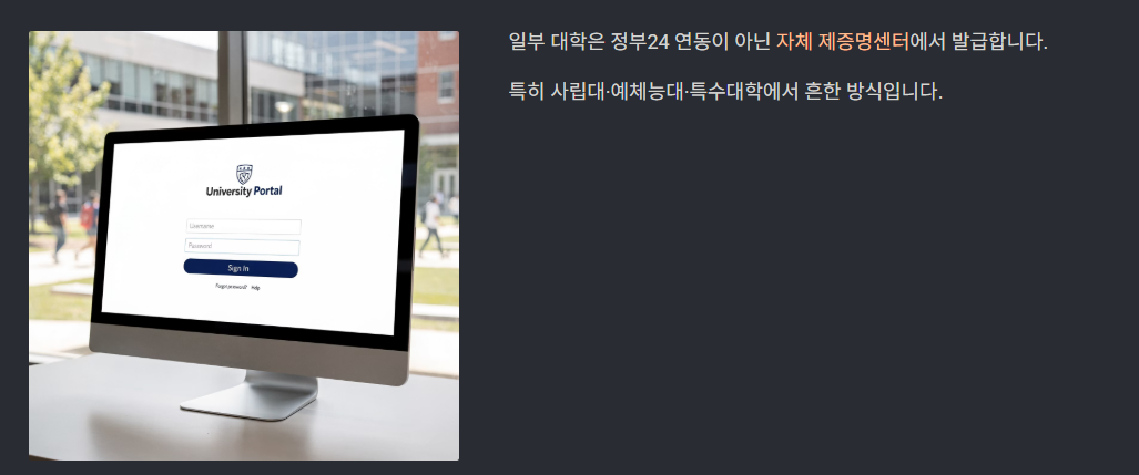 다만 일부 대학은 *학교 전용 발급 사이트 또는 제증명센터(러닝포털 등)*를 사용하기도 합니다.