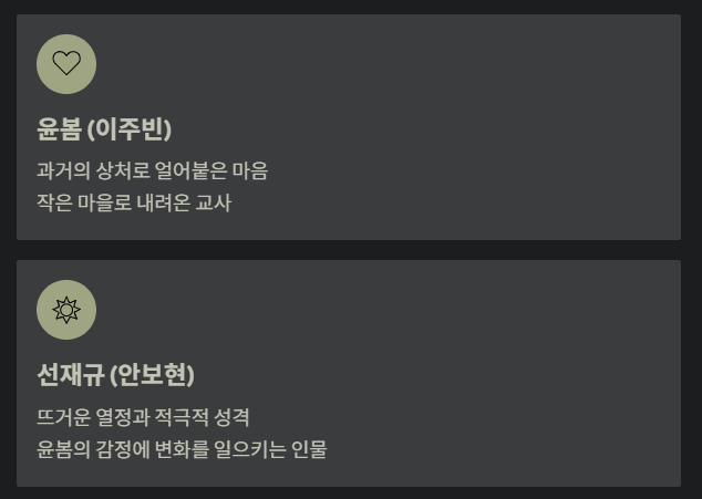 - 윤봄(이주빈): 과거의 상처로 마음이 얼어붙은 상태에서 작은 마을로 내려온 교사