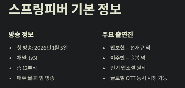 스프링피버는 2026년 1월 5일에 tvN에서 첫 방송된 한국 로맨틱 코미디 드라마입니다.