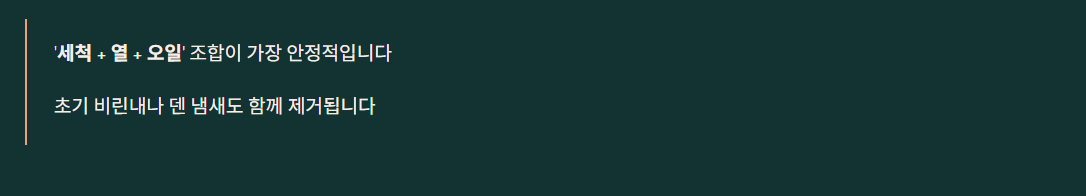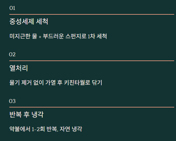 - 냄새 남으면 차가운 물 + 1시간 방치