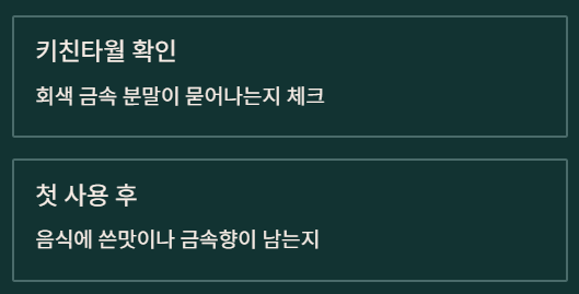 - 첫 사용 후 음식에 쓴맛 or 금속향이 남는지