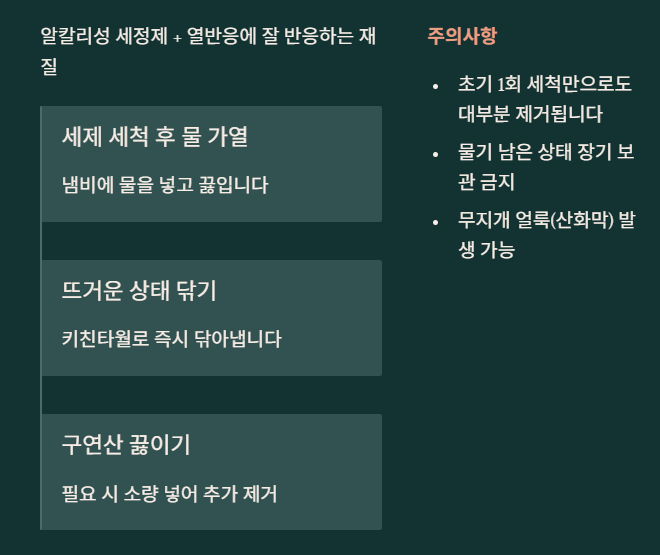 주의할 점은 강한 수세미, 금속수세미, 베이킹소다 직접문지르기는 코팅 손상 위험이 있어 피하는 게 좋습니다.