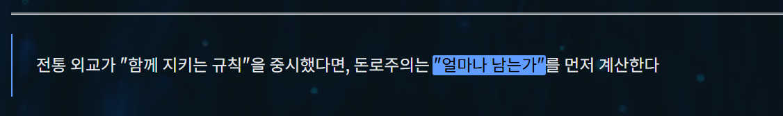 - 돈로주의는 외교를 실익과 소유 중심으로 보는 사고방식