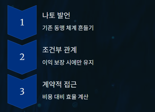“동맹이 미국의 이익을 보장하지 않는다면 재고할 수 있다”는 메시지다.
