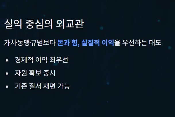 가치, 동맹, 규범보다 돈과 힘, 실익 중심으로 판단하는 태도를 뜻한다.