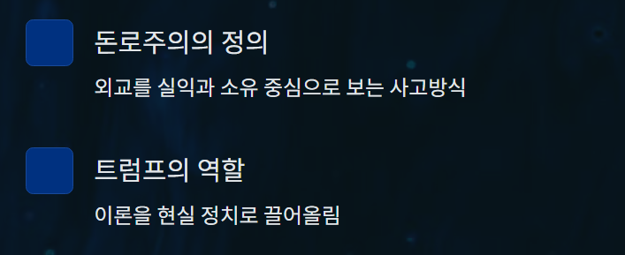 이 때문에 전문가들은 트럼프식 외교를 돈로주의의 대표적 사례로 분석한다.