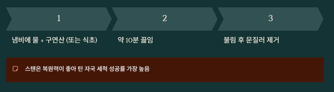 탄 냄비는 단순 세척이 아니라 재질 특성에 맞춰 처리해야 손상 없이 복구할 수 있습니다.