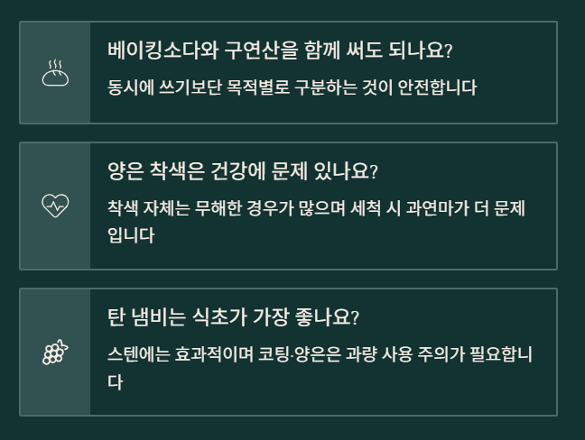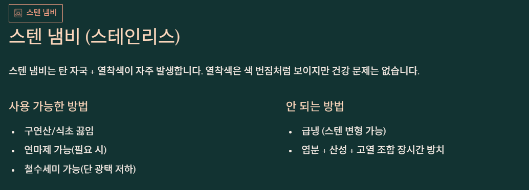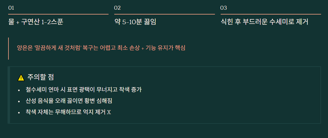 양은은 착색 최소화, 스텐은 연마 중심, 코팅은 불림 중심으로 접근하는 것이 가장 효율적이며 교체 시점 판단도 중요합니다.