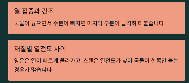 국물이나 물이 끓으면서 수분이 빠지면 마지막 부분이 급격히 타붙습니다.