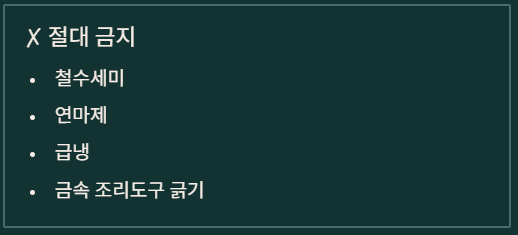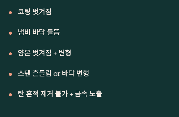 - 염분 + 산성 + 고열 조합 장시간 방치