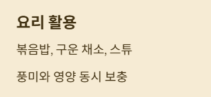 - 점심: 볶음밥이나 구운 채소에 활용 → 균형 잡힌 식단
