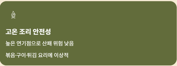 - 연기점이 높아 고온 조리에도 안정적