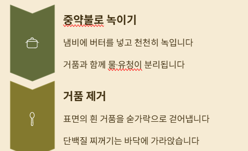 냄비에 버터를 넣고 중약불에서 녹입니다. 버터가 녹으면서 거품이 생기고, 물과 유청이 분리됩니다.