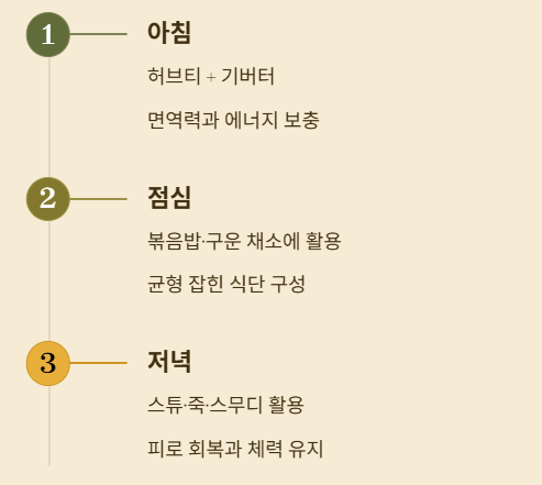 - 저녁: 스튜·죽·스무디 활용 → 피로 회복과 체력 유지