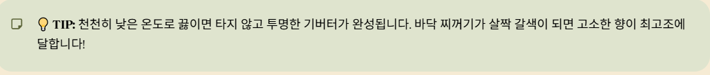 팁: 천천히 낮은 온도로 끓이면 타지 않고 투명한 기버터가 완성되며, 바닥 찌꺼기가 살짝 갈색으로 변하면 고소한 향이 극대화됩니다.