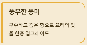 - 풍미가 강하고 구수한 향이 있어 음식 맛을 살려줌
