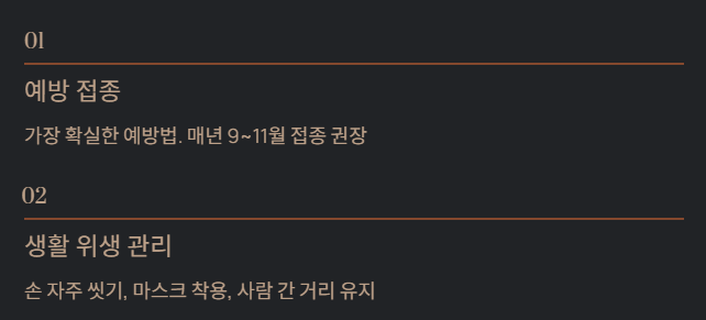 - 예방: 독감 백신 + 생활 위생 + 면역력 관리