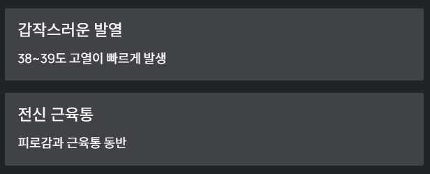 | 발열 | 갑작스러운 38~39도 발열 |