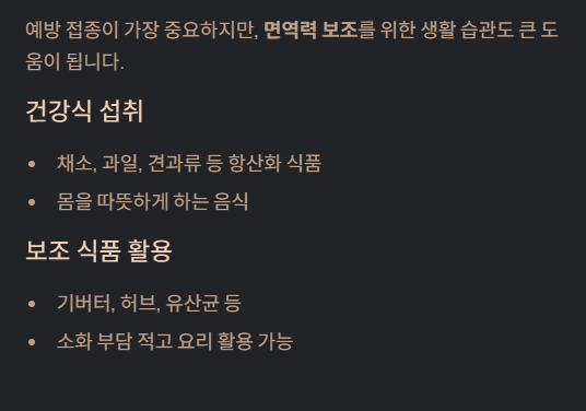 TIP: 건강식만으로 독감을 완전히 예방할 수 없으므로, 항상 백신 + 생활 관리를 병행