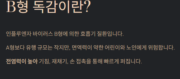 - A형 독감과 달리 유행 규모가 제한적이지만, 면역력이 약한 어린이와 노인에게 위험이 높습니다.