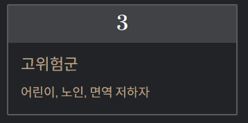 - 감염자: 어린이, 노인, 면역 저하자 주의
