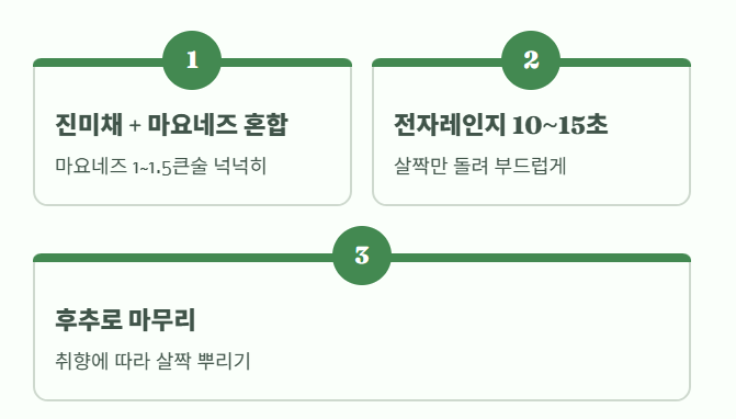 - 진미채 + 고추장 1큰술 + 설탕/올리고당 0.5큰술 + 참기름 약간