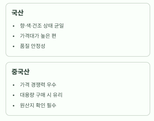 - 국산: 향·색·건조 상태가 균일하며 가격대가 높은 편입니다.