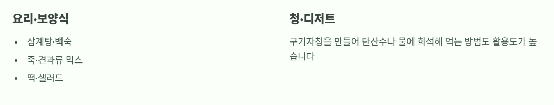 삼계탕, 백숙, 죽, 견과류 믹스, 떡, 샐러드 등에도 응용할 수 있습니다.