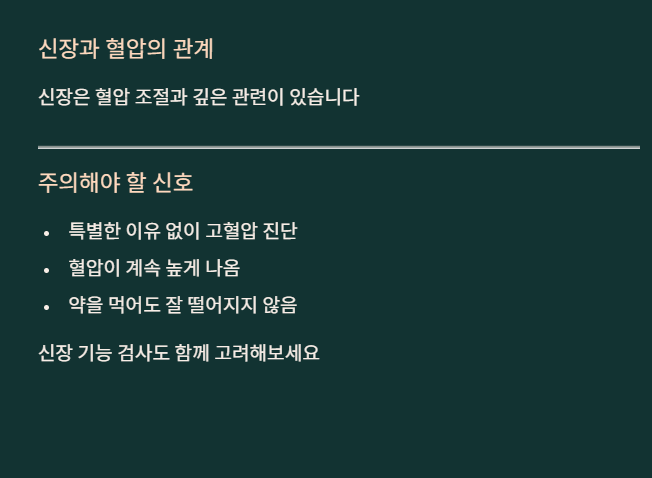 그래서 평소 혈압이 정상이던 사람이 특별한 이유 없이 고혈압 진단을 받는 경우, 신장 문제와 함께 확인해보는 것이 좋습니다.