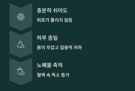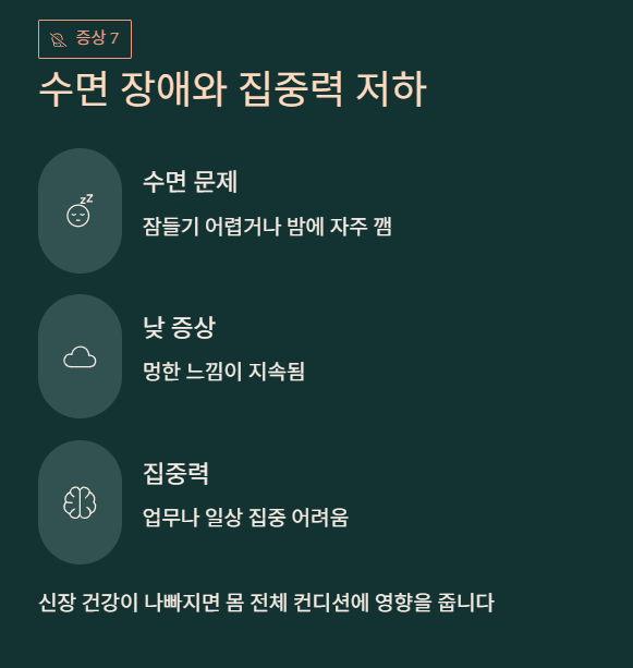 신장이 노폐물을 제대로 걸러내지 못하면 혈액 속에 쌓이게 되고, 이로 인해 만성 피로, 무기력, 집중력 저하가 나타날 수 있습니다.