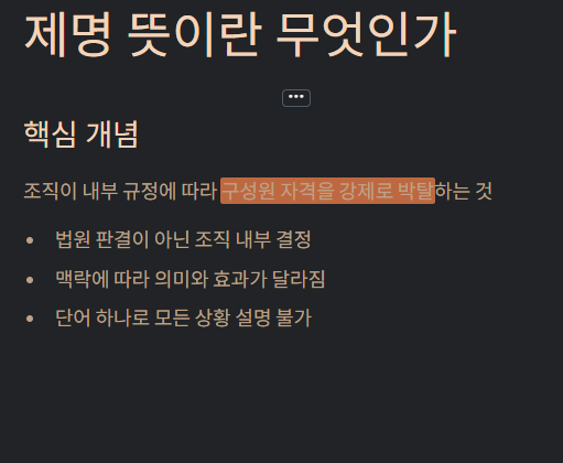 즉, 제명은 법원이 판단하는 형벌이 아니라, 조직 내부에서 결정하는 조치다.
