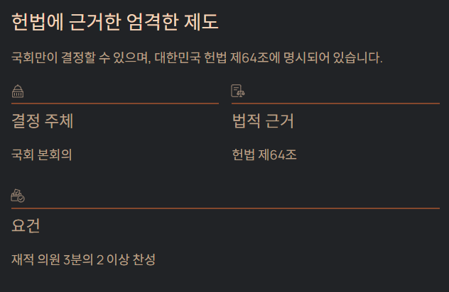 - 요건: 재적 의원 3분의 2 이상 찬성